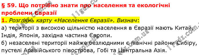 § 59. Що потрібно знати про населення та екологічні проблеми Євразії 1. Розглянь карту «Населення Євразії». Визнач: а) території з високою щільністю населення в Євразії мають Китай, Індія, Японія, західна частина Європи. б) незаселені території майже безлюдними є північні райони Сибіру, пустелі Аравійського півострова, Гобі та Центральна Азія.