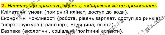 2. Напиши, що враховує людина, вибираючи місце проживання. Кліматичні умови (помірний клімат, доступ до води). Економічні можливості (робота, рівень зарплат, доступ до ринків). Інфраструктура (транспорт, медицина, освіта). Безпека (екологічні, соціальні, політичні аспекти).