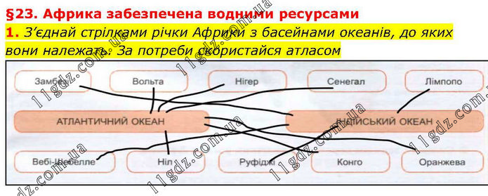 §23. Африка забезпечена водними ресурсами 1. З’єднай стрілками річки Африки з басейнами океанів, до яких вони належать. За потреби скористайся атласом