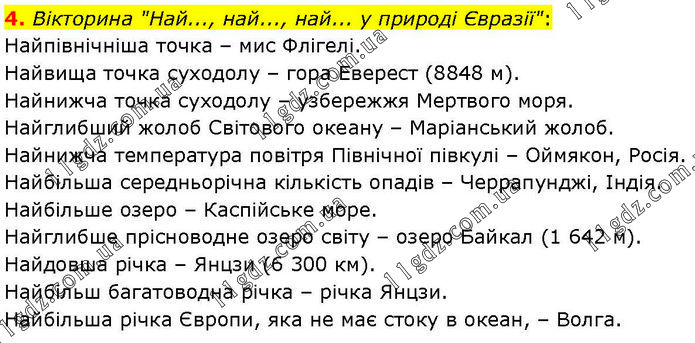 4. Вікторина "Най..., най..., най... у природі Євразії": Найпівнічніша точка – мис Флігелі. Найвища точка суходолу – гора Еверест (8848 м). Найнижча точка суходолу – узбережжя Мертвого моря. Найглибший жолоб Світового океану – Маріанський жолоб. Найнижча температура повітря Північної півкулі – Оймякон, Росія. Найбільша середньорічна кількість опадів – Черрапунджі, Індія. Найбільше озеро – Каспійське море. Найглибше прісноводне озеро світу – озеро Байкал (1 642 м). Найдовша річка – Янцзи (6 300 км). Найбільш багатоводна річка – річка Янцзи. Найбільша річка Європи, яка не має стоку в океан, – Волга.