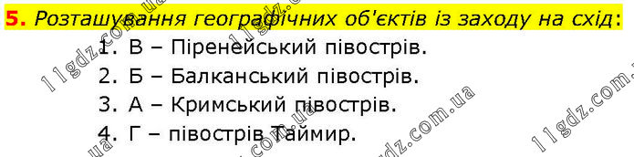 Розташування географічних об'єктів із заходу на схід: 1. В – Піренейський півострів. 2. Б – Балканський півострів. 3. А – Кримський півострів. 4. Г – півострів Таймир.