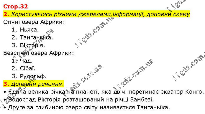 2. Користуючись різними джерелами інформації, доповни схему Стічні озера Африки: 1. Ньяса. 2. Танганьїка. 3. Вікторія. Безстічні озера Африки: 1. Чад. 2. Сібаї. 3. Рудольф. 3. Доповни речення. • Єдина велика річка на планеті, яка двічі перетинає екватор Конго. • Водоспад Вікторія розташований на річці Замбезі. • Друге за глибиною озеро світу називається Танганьїка.