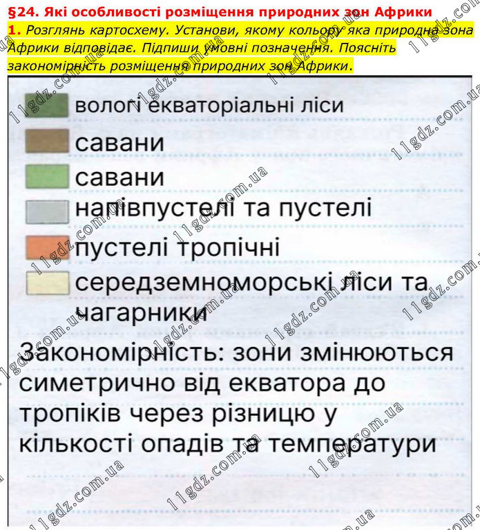 §24. Які особливості розміщення природних зон Африки 1. Розглянь картосхему. Установи, якому кольору яка природна зона Африки відповідає. Підпиши умовні позначення. Поясніть закономірність розміщення природних зон Африки.
