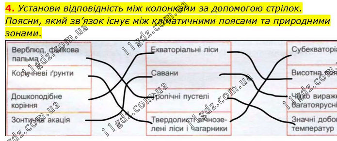 Установи відповідність між колонками за допомогою стрілок. Поясни, який зв’язок існує між кліматичними поясами та природними зонами.
