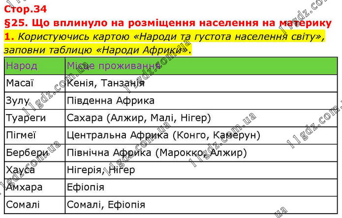 §25. Що вплинуло на розміщення населення на материку 1. Користуючись картою «Народи та густота населення світу», заповни таблицю «Народи Африки».