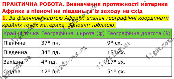 ПРАКТИЧНА РОБОТА. Визначення протяжності материка Африка з півночі на південь та із заходу на схід 1. За фізичною картою Африки визнач географічні координати крайніх точок материка. Заповни таблицю.
