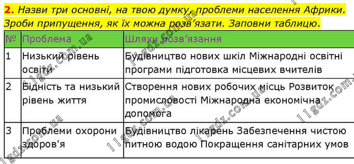 Назви три основні, на твою думку, проблеми населення Африки. Зроби припущення, як їх можна розв’язати. Заповни таблицю. № Проблема Шляхи розв’язання 1 Низький рівень освіти Будівництво нових шкіл Міжнародні освітні програми підготовка місцевих вчителів 2 Бідність та низький рівень життя Створення нових робочих місць Розвиток промисловості Міжнародна економічна допомога 3 Проблеми охорони здоров'я Будівництво лікарень Забезпечення чистою питною водою Покращення санітарних умов