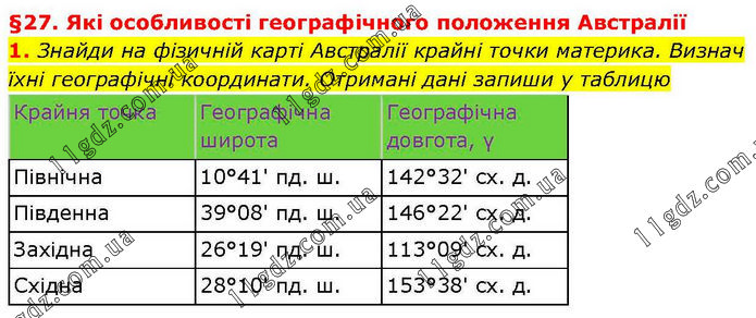 §27. Які особливості географічного положення Австралії 1. Знайди на фізичній карті Австралії крайні точки материка. Визнач їхні географічні координати. Отримані дані запиши у таблицю Крайня точка Географічна широта Географічна довгота, γ Північна 10°41' пд. ш. 142°32' сх. д. Південна 39°08' пд. ш. 146°22' сх. д. Західна 26°19' пд. ш. 113°09' сх. д. Східна 28°10' пд. ш. 153°38' сх. д.