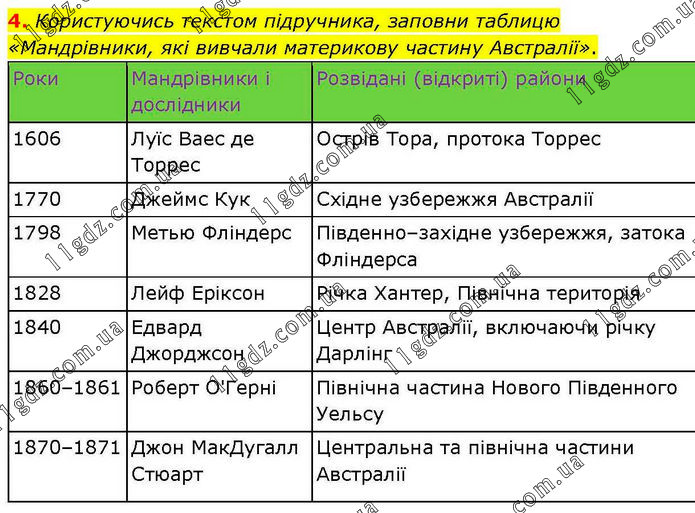 Користуючись текстом підручника, заповни таблицю «Мандрівники, які вивчали материкову частину Австралії». Роки Мандрівники і дослідники Розвідані (відкриті) райони 1606 Луїс Ваес де Торрес Острів Тора, протока Торрес 1770 Джеймс Кук Східне узбережжя Австралії 1798 Метью Фліндерс Південно–західне узбережжя, затока Фліндерса 1828 Лейф Еріксон Річка Хантер, Північна територія 1840 Едвард Джорджсон Центр Австралії, включаючи річку Дарлінг 1860–1861 Роберт О'Герні Північна частина Нового Південного Уельсу 1870–1871 Джон МакДугалл Стюарт Центральна та північна частини Австралії