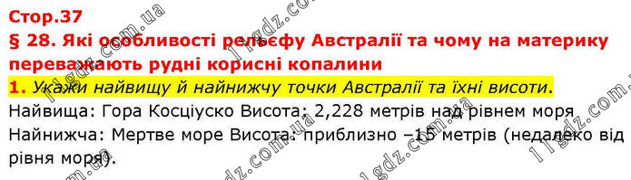 § 28. Які особливості рельєфу Австралії та чому на материку переважають рудні корисні копалини 1. Укажи найвищу й найнижчу точки Австралії та їхні висоти. Найвища: Гора Косціуско Висота: 2,228 метрів над рівнем моря Найнижча: Мертве море Висота: приблизно –15 метрів (недалеко від рівня моря).