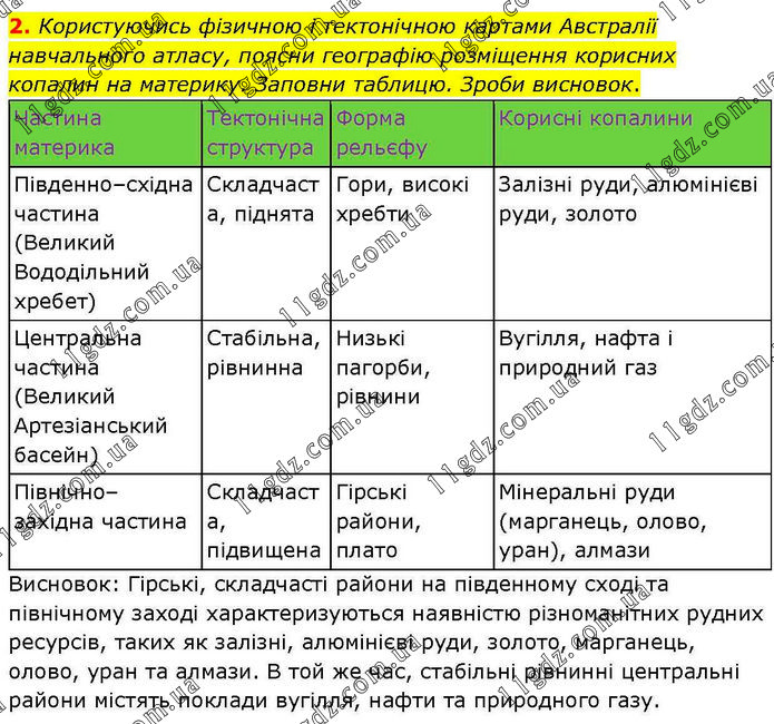 Користуючись фізичною і тектонічною картами Австралії навчального атласу, поясни географію розміщення корисних копалин на материку. Заповни таблицю. Зроби висновок. Висновок: Гірські, складчасті райони на південному сході та північному заході характеризуються наявністю різноманітних рудних ресурсів, таких як залізні, алюмінієві руди, золото, марганець, олово, уран та алмази. В той же час, стабільні рівнинні центральні райони містять поклади вугілля, нафти та природного газу.