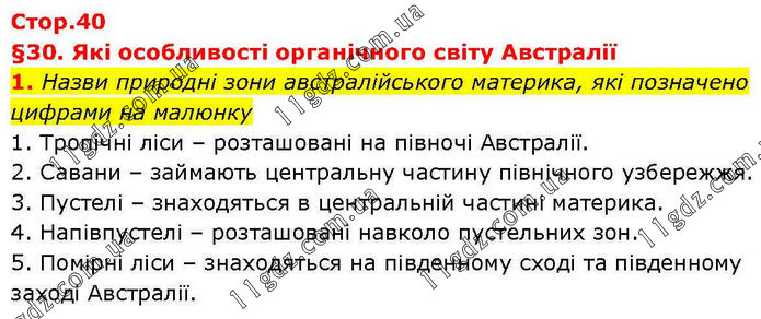 §30. Які особливості органічного світу Австралії 1. Назви природні зони австралійського материка, які позначено цифрами на малюнку 1. Тропічні ліси – розташовані на півночі Австралії. 2. Савани – займають центральну частину північного узбережжя. 3. Пустелі – знаходяться в центральній частині материка. 4. Напівпустелі – розташовані навколо пустельних зон. 5. Помірні ліси – знаходяться на південному сході та південному заході Австралії.