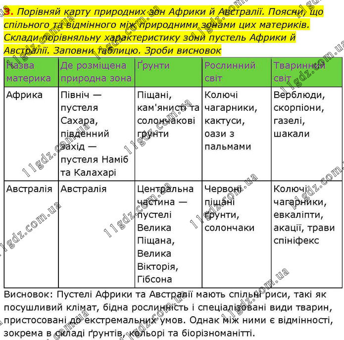 Порівняй карту природних зон Африки й Австралії. Поясни, що спільного та відмінного між природними зонами цих материків. Склади порівняльну характеристику зони пустель Африки й Австралії. Заповни таблицю. Зроби висновок Назва материка Де розміщена природна зона Ґрунти Рослинний світ Тваринний світ Африка Північ — пустеля Сахара, південний захід — пустеля Наміб та Калахарі Піщані, кам'янисті та солончакові грунти Колючі чагарники, кактуси, оази з пальмами Верблюди, скорпіони, газелі, шакали Австралія Австралія Центральна частина — пустелі Велика Піщана, Велика Вікторія, Гібсона Червоні піщані ґрунти, солончаки Колючі чагарники, евкаліпти, акації, трави спініфекс Висновок: Пустелі Африки та Австралії мають спільні риси, такі як посушливий клімат, бідна рослинність і спеціалізовані види тварин, пристосовані до екстремальних умов. Однак між ними є відмінності, зокрема в складі ґрунтів, кольорі та біорізноманітті.