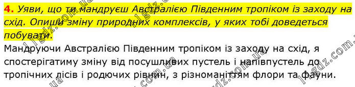 Уяви, що ти мандруєш Австралією Південним тропіком із заходу на схід. Опиши зміну природних комплексів, у яких тобі доведеться побувати. Мандруючи Австралією Південним тропіком із заходу на схід, я спостерігатиму зміну від посушливих пустель і напівпустель до тропічних лісів і родючих рівнин, з різноманіттям флори та фауни.
