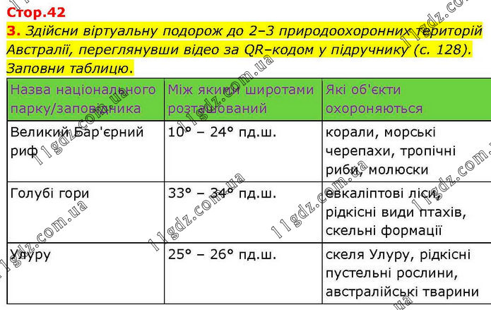 Здійсни віртуальну подорож до 2–3 природоохоронних територій Австралії, переглянувши відео за QR–кодом у підручнику (с. 128). Заповни таблицю. Назва національного парку/заповідника Між якими широтами розташований Які об'єкти охороняються Великий Бар'єрний риф 10° – 24° пд.ш. корали, морські черепахи, тропічні риби, молюски Голубі гори 33° – 34° пд.ш. евкаліптові ліси, рідкісні види птахів, скельні формації Улуру 25° – 26° пд.ш. скеля Улуру, рідкісні пустельні рослини, австралійські тварини