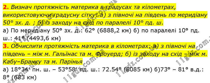 2. Визнач протяжність материка в градусах та кілометрах, використовуючи градусну сітку: а) з півночі на південь по меридіану 50° зх. д. ; б) із заходу на схід по паралелі 10° пд. ш. а) По меридіану 50° зх. д.: 62° (6888,2 км) б) по паралелі 10° пд. ш.: 41° (4493,6 км). 3. Обчислити протяжність материка в кілометрах: а) з півночі на південь – між м. Гальїнас та м. Фроуерд; б) із заходу на схід – між м. Кабу–Бранку та м. Парінья а) 18°34′ пн. ш. – 53°58′ пд. ш.: 72.54° (8085 км) б)73° – 81° в.д.: 8° (683 км).