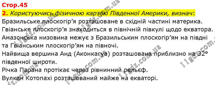 Користуючись фізичною картою Південної Америки, визнач: Бразильське плоскогір’я розташоване в східній частині материка. Гвіанське плоскогір’я знаходиться в північній півкулі щодо екватора. Амазонська низовина межує з Бразильським плоскогір’ям на півдні та Гвіанським плоскогір’ям на півночі. Найвища вершина Анд (Аконкагуа) розташована приблизно на 32° південної широти. Річка Парана протікає через рівнинний рельєф. Вулкан Котопахі розташований майже на екваторі.