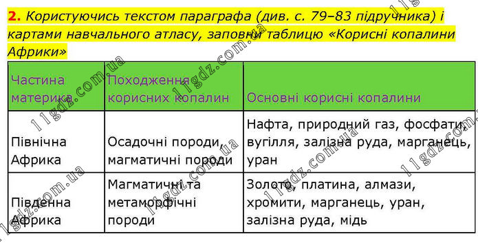 Користуючись текстом параграфа (див. с. 79–83 підручника) і картами навчального атласу, заповни таблицю «Корисні копалини Африки» Частина материка Походження корисних копалин Основні корисні копалини Північна Африка Осадочні породи, магматичні породи Нафта, природний газ, фосфати, вугілля, залізна руда, марганець, уран Південна Африка Магматичні та метаморфічні породи Золото, платина, алмази, хромити, марганець, уран, залізна руда, мідь