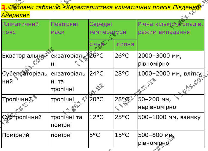 Заповни таблицю «Характеристика кліматичних поясів Південної Америки»