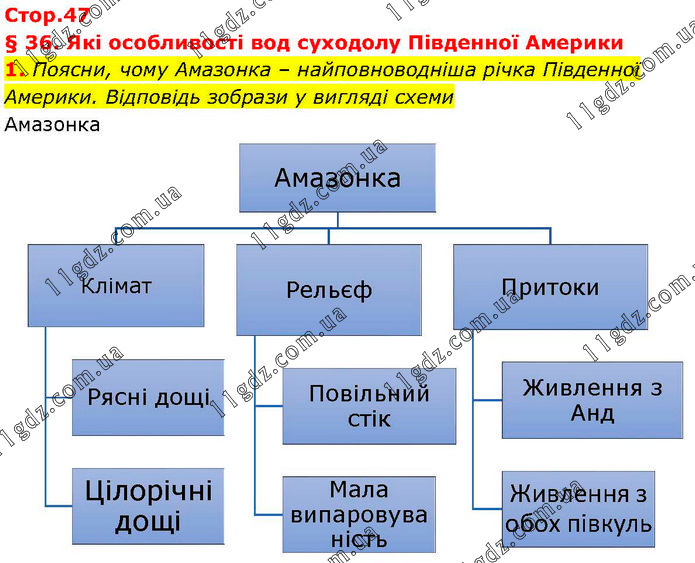 § 36. Які особливості вод суходолу Південної Америки 1. Поясни, чому Амазонка – найповноводніша річка Південної Америки. Відповідь зобрази у вигляді схеми Амазонка