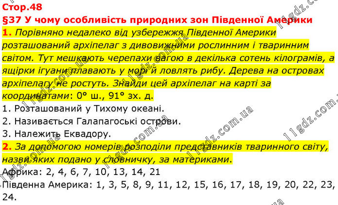 §37 У чому особливість природних зон Південної Америки 1. Порівняно недалеко від узбережжя Південної Америки розташований архіпелаг з дивовижними рослинним і тваринним світом. Тут мешкають черепахи вагою в декілька сотень кілограмів, а ящірки ігуани плавають у морі й ловлять рибу. Дерева на островах архіпелагу не ростуть. Знайди цей архіпелаг на карті за координатами: 0° ш., 91° зх. д. 1. Розташований у Тихому океані. 2. Називається Галапагоські острови. 3. Належить Еквадору. 2. За допомогою номерів розподіли представників тваринного світу, назви яких подано у словничку, за материками. Африка: 2, 4, 6, 7, 10, 13, 14, 21 Південна Америка: 1, 3, 5, 8, 9, 11, 12, 15, 16, 17, 18, 19, 20, 22, 23, 24.