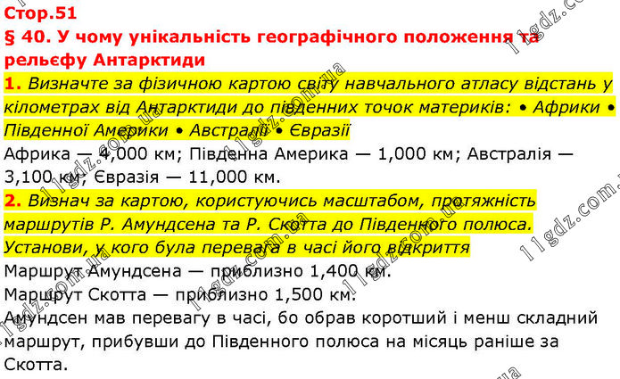 § 40. У чому унікальність географічного положення та рельєфу Антарктиди 1. Визначте за фізичною картою світу навчального атласу відстань у кілометрах від Антарктиди до південних точок материків: • Африки • Південної Америки • Австралії • Євразії Африка — 4,000 км; Південна Америка — 1,000 км; Австралія — 3,100 км; Євразія — 11,000 км. 2. Визнач за картою, користуючись масштабом, протяжність маршрутів Р. Амундсена та Р. Скотта до Південного полюса. Установи, у кого була перевага в часі його відкриття Маршрут Амундсена — приблизно 1,400 км. Маршрут Скотта — приблизно 1,500 км. Амундсен мав перевагу в часі, бо обрав коротший і менш складний маршрут, прибувши до Південного полюса на місяць раніше за Скотта.