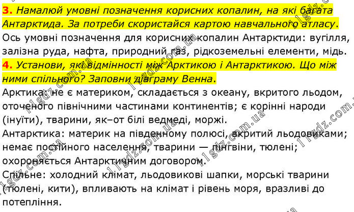 3. Намалюй умовні позначення корисних копалин, на які багата Антарктида. За потреби скористайся картою навчального атласу. Ось умовні позначення для корисних копалин Антарктиди: вугілля, залізна руда, нафта, природний газ, рідкоземельні елементи, мідь. 4. Установи, які відмінності між Арктикою і Антарктикою. Що між ними спільного? Заповни діаграму Венна. Арктика: не є материком, складається з океану, вкритого льодом, оточеного північними частинами континентів; є корінні народи (інуїти), тварини, як–от білі ведмеді, моржі. Антарктика: материк на південному полюсі, вкритий льодовиками; немає постійного населення, тварини — пінгвіни, тюлені; охороняється Антарктичним договором. Спільне: холодний клімат, льодовикові шапки, морські тварини (тюлені, кити), впливають на клімат і рівень моря, вразливі до потепління.
