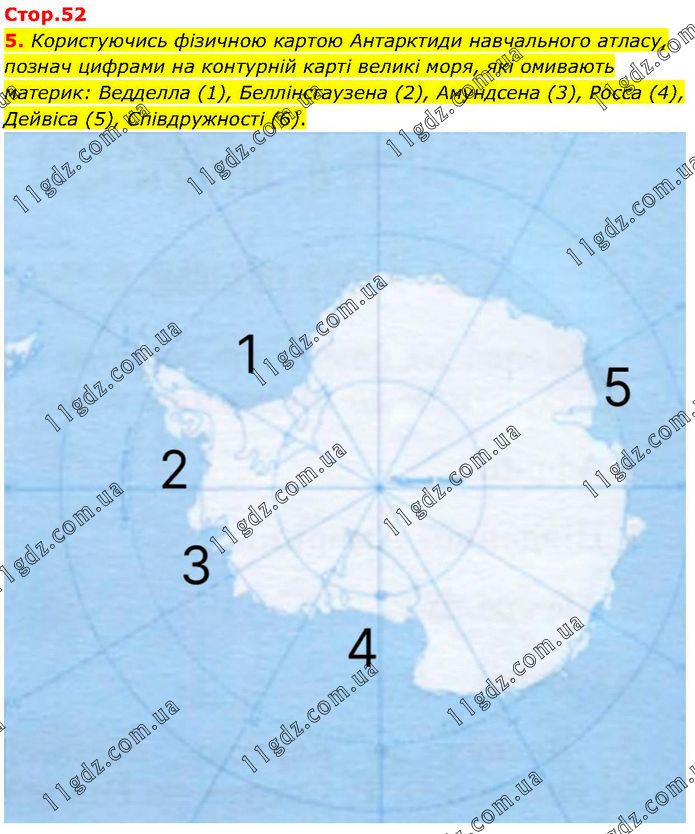 Користуючись фізичною картою Антарктиди навчального атласу, познач цифрами на контурній карті великі моря, які омивають материк: Ведделла (1), Беллінсгаузена (2), Амундсена (3), Росса (4), Дейвіса (5), Співдружності (6).