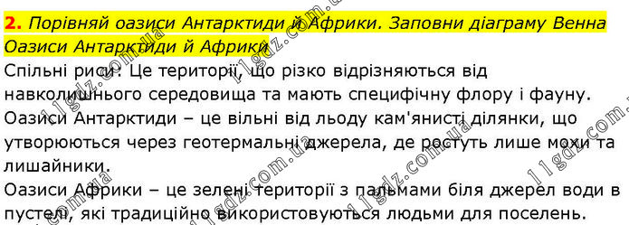 Порівняй оазиси Антарктиди й Африки. Заповни діаграму Венна Оазиси Антарктиди й Африки Спільні риси: Це території, що різко відрізняються від навколишнього середовища та мають специфічну флору і фауну. Оазиси Антарктиди – це вільні від льоду кам'янисті ділянки, що утворюються через геотермальні джерела, де ростуть лише мохи та лишайники. Оазиси Африки – це зелені території з пальмами біля джерел води в пустелі, які традиційно використовуються людьми для поселень.
