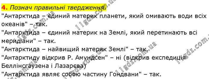 Познач правильні твердження. "Антарктида – єдиний материк планети, який омивають води всіх океанів" – так. "Антарктида – єдиний материк на Землі, який перетинають всі меридіани" – так. "Антарктида – найвищий материк Землі" – так. "Антарктиду відкрив Р. Амундсен" – ні (відкрив експедиція Беллінсгаузена і Лазарєва) "Антарктида являє собою частину Гондвани" – так.