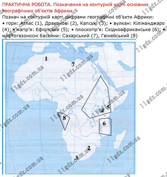 ПРАКТИЧНА РОБОТА. Позначення на контурній карті основних географічних об'єктів Африки Познач на контурній карті цифрами географічні об’єкти Африки: • гори: Атлас (1), Драконові (2), Капські (3); • вулкан: Кіліманджаро (4); • нагір’я: Ефіопське (5); • плоскогір’я: Східноафриканське (6); • нафтогазоносні басейни: Сахарський (7), Гвінейський (8)