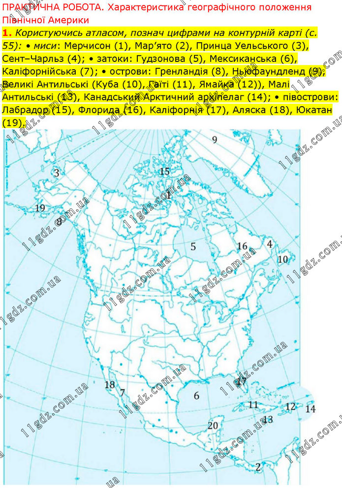 ПРАКТИЧНА РОБОТА. Характеристика географічного положення Північної Америки 1. Користуючись атласом, познач цифрами на контурній карті (с. 55): • миси: Мерчисон (1), Мар’ято (2), Принца Уельського (3), Сент–Чарльз (4); • затоки: Гудзонова (5), Мексиканська (6), Каліфорнійська (7); • острови: Гренландія (8), Ньюфаундленд (9), Великі Антильські (Куба (10), Гаїті (11), Ямайка (12)), Малі Антильські (13), Канадський Арктичний архіпелаг (14); • півострови: Лабрадор (15), Флорида (16), Каліфорнія (17), Аляска (18), Юкатан (19).