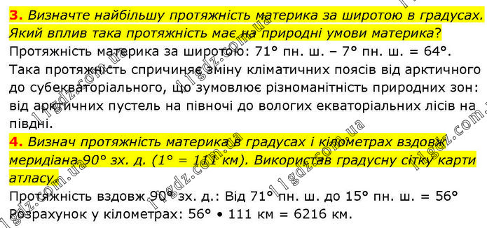 3. Визначте найбільшу протяжність материка за широтою в градусах. Який вплив така протяжність має на природні умови материка? Протяжність материка за широтою: 71° пн. ш. – 7° пн. ш. = 64°. Така протяжність спричиняє зміну кліматичних поясів від арктичного до субекваторіального, що зумовлює різноманітність природних зон: від арктичних пустель на півночі до вологих екваторіальних лісів на півдні. 4. Визнач протяжність материка в градусах і кілометрах вздовж меридіана 90° зх. д. (1° = 111 км). Використав градусну сітку карти атласу. Протяжність вздовж 90° зх. д.: Від 71° пн. ш. до 15° пн. ш. = 56° Розрахунок у кілометрах: 56° • 111 км = 6216 км.