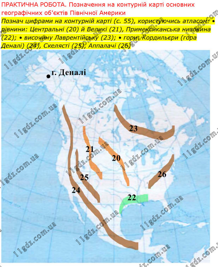 ПРАКТИЧНА РОБОТА. Позначення на контурній карті основних географічних об'єктів Північної Америки Познач цифрами на контурній карті (с. 55), користуючись атласом: • рівнини: Центральні (20) й Великі (21), Примексиканська низовина (22); • височину Лаврентійську (23); • гори: Кордильєри (гора Деналі) (24), Скелясті (25), Аппалачі (26)