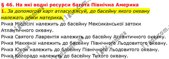§ 46. На які водні ресурси багата Північна Америка 1. За допомогою карт атласу з’ясуй, до басейну якого океану належать річки материка. Річка Міссісіпі належить до басейну Мексиканської затоки Атлантичного океану. Річка Святого Лаврентія належить до басейну Атлантичного океану. Річка Маккензі належить до басейну Північного Льодовитого океану. Річка Юкон належить до басейну Північного Льодовитого океану. Річка Колорадо належить до басейну Тихого океану.