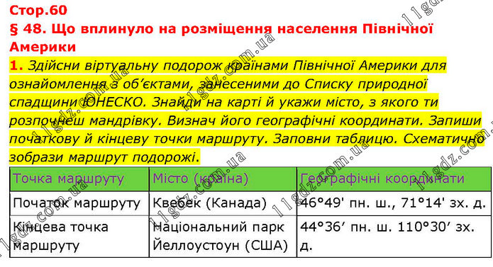 § 48. Що вплинуло на розміщення населення Північної Америки 1. Здійсни віртуальну подорож країнами Північної Америки для ознайомлення з об’єктами, занесеними до Списку природної спадщини ЮНЕСКО. Знайди на карті й укажи місто, з якого ти розпочнеш мандрівку. Визнач його географічні координати. Запиши початкову й кінцеву точки маршруту. Заповни таблицю. Схематично зобрази маршрут подорожі.