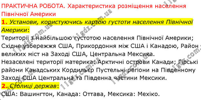 ПРАКТИЧНА РОБОТА. Характеристика розміщення населення Північної Америки 1. Установи, користуючись картою густоти населення Північної Америки: Території з найбільшою густотою населення Північної Америки; Східне узбережжя США, Прикордоння між США і Канадою, Район великих міст на Заході США, Центральна Мексика. Незаселені території материка: Арктичні острови Канади; Гірські райони Канадських Кордильєр Пустельні регіони на Південному Заході США Центральна та Південна частини Мексики. 2. Столиці держав: США: Вашингтон, Канада: Оттава, Мексика: Мехіко.