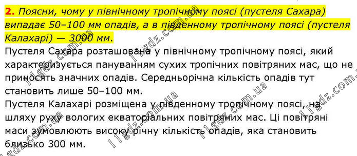 2. Поясни, чому у північному тропічному поясі (пустеля Сахара) випадає 50–100 мм опадів, а в південному тропічному поясі (пустеля Калахарі) — 3000 мм. Пустеля Сахара розташована у північному тропічному поясі, який характеризується пануванням сухих тропічних повітряних мас, що не приносять значних опадів. Середньорічна кількість опадів тут становить лише 50–100 мм. Пустеля Калахарі розміщена у південному тропічному поясі, на шляху руху вологих екваторіальних повітряних мас. Ці повітряні маси зумовлюють високу річну кількість опадів, яка становить близько 300 мм.