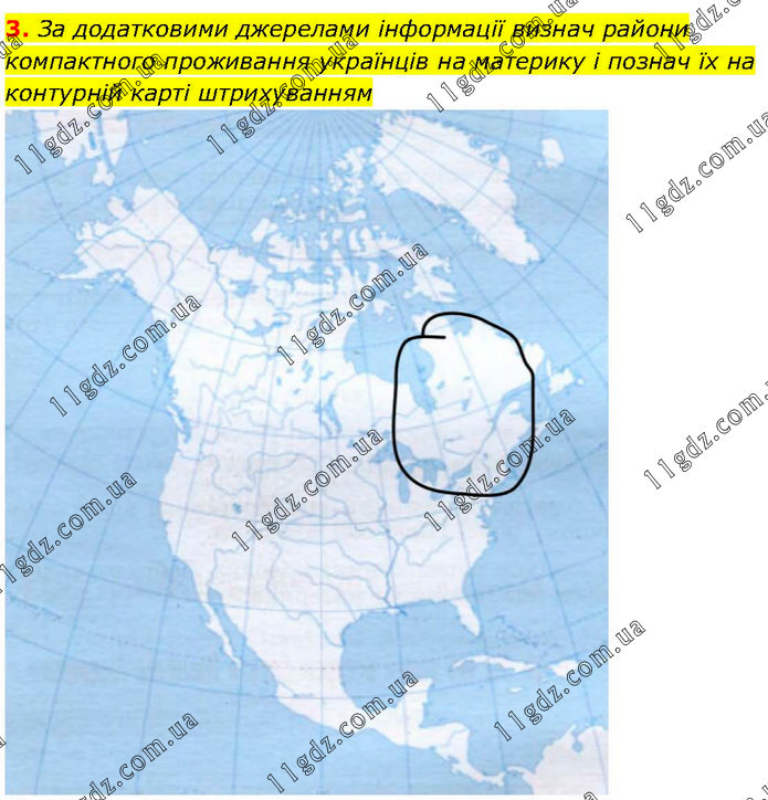 За додатковими джерелами інформації визнач райони компактного проживання українців на материку і познач їх на контурній карті штрихуванням