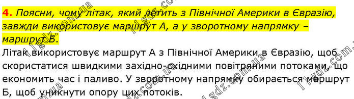 Поясни, чому літак, який летить з Північної Америки в Євразію, завжди використовує маршрут А, а у зворотному напрямку – маршрут Б. Літак використовує маршрут А з Північної Америки в Євразію, щоб скористатися швидкими західно-східними повітряними потоками, що економить час і паливо. У зворотному напрямку обирається маршрут Б, щоб уникнути опору цих потоків.