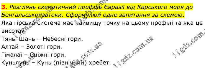Розглянь схематичний профіль Євразії від Карського моря до Бенгальської затоки. Сформулюй одне запитання за схемою. Яка гірська система має найвищу точку на цьому профілі та яка це висота? Тянь–Шань – Небесні гори. Алтай – Золоті гори. Гімалаї – Сніжні гори. Куньлунь – Кунь (північний) хребет.