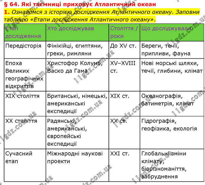 § 64. Які таємниці приховує Атлантичний океан 1. Ознайомся з історією дослідження Атлантичного океану. Заповни таблицю «Етапи дослідження Атлантичного океану».