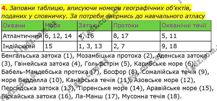 Заповни таблицю, вписуючи номери географічних об’єктів, поданих у словничку. За потреби звернись до навчального атласу Океани Моря Затоки Протоки Океанічні течії Атлантичний 6, 12, 14 4, 16 8, 17 5, 11 Індійський 15 1, 3, 13 2, 7 9, 18 Бенгальська затока (1), Мозамбіцька протока (2), Аденська затока (3), Гвінейська затока (4), Гольфстрім (5), Карибське море (6), Бабель-Мандебська протока (7), Босфор (8), Сомалійська течія (9), море Ведделла (10), Канарська течія (11), Азовське море (12), Персидська затока (13), Тірренське море (14), Аравійське море (15), Біскайська затока (16), Ла-Манш (17), Мусонна течія (18).