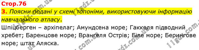 Поясни подані у схемі топоніми, використовуючи інформацію навчального атласу. Шпіцберген – архіпелаг; Амундсена море; Гаккеля підводний хребет; Баренцове море; Врангеля Острів; Біле море; Берингове море; штат Аляска.