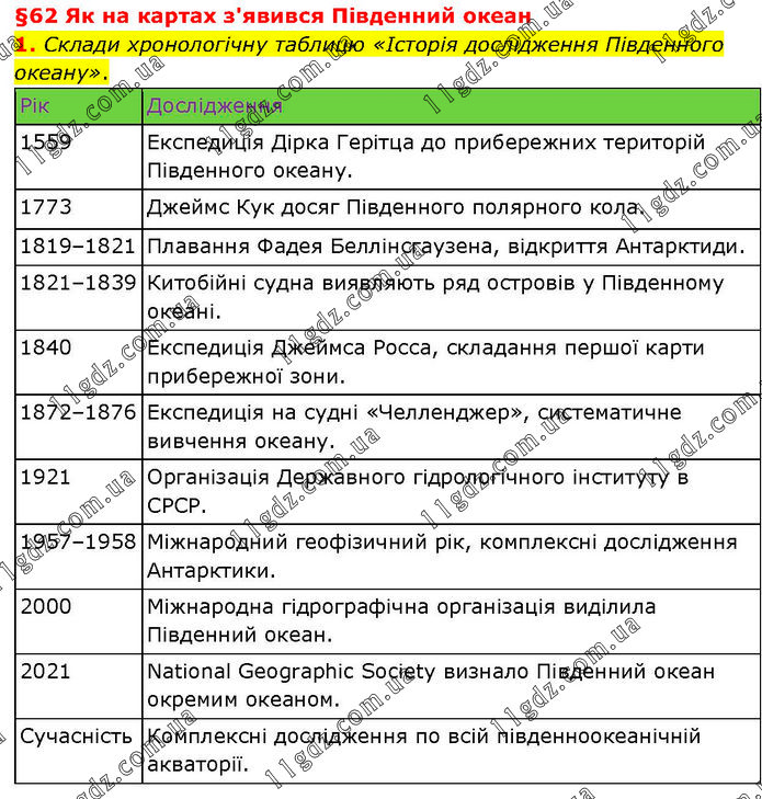 §62 Як на картах з'явився Південний океан 1. Склади хронологічну таблицю «Історія дослідження Південного океану».