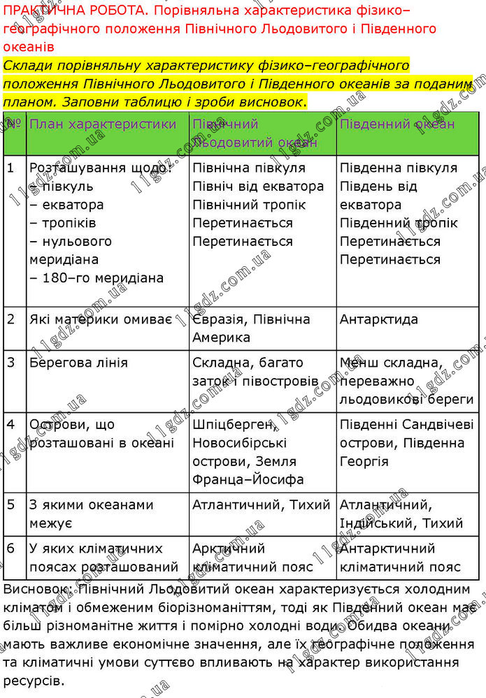 ПРАКТИЧНА РОБОТА. Порівняльна характеристика фізико–географічного положення Північного Льодовитого і Південного океанів Склади порівняльну характеристику фізико–географічного положення Північного Льодовитого і Південного океанів за поданим планом. Заповни таблицю і зроби висновок. Висновок: Північний Льодовитий океан характеризується холодним кліматом і обмеженим біорізноманіттям, тоді як Південний океан має більш різноманітне життя і помірно холодні води. Обидва океани мають важливе економічне значення, але їх географічне положення та кліматичні умови суттєво впливають на характер використання ресурсів.
