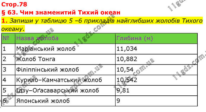§ 63. Чим знаменитий Тихий океан 1. Запиши у таблицю 5–6 прикладів найглибших жолобів Тихого океану.