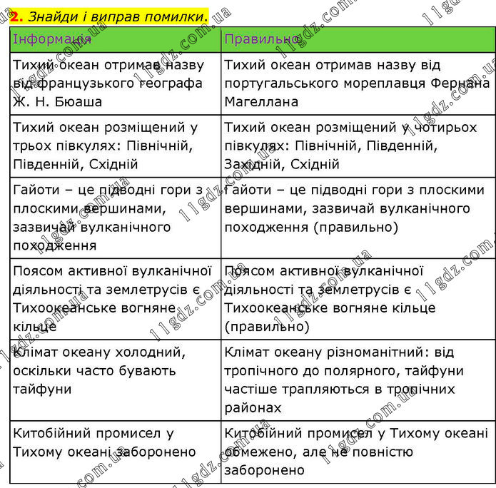 Знайди і виправ помилки. Інформація Правильно Тихий океан отримав назву від французького географа Ж. Н. Бюаша Тихий океан отримав назву від португальського мореплавця Фернана Магеллана Тихий океан розміщений у трьох півкулях: Північній, Південній, Східній Тихий океан розміщений у чотирьох півкулях: Північній, Південній, Західній, Східній Гайоти – це підводні гори з плоскими вершинами, зазвичай вулканічного походження Гайоти – це підводні гори з плоскими вершинами, зазвичай вулканічного походження (правильно) Поясом активної вулканічної діяльності та землетрусів є Тихоокеанське вогняне кільце Поясом активної вулканічної діяльності та землетрусів є Тихоокеанське вогняне кільце (правильно) Клімат океану холодний, оскільки часто бувають тайфуни Клімат океану різноманітний: від тропічного до полярного, тайфуни частіше трапляються в тропічних районах Китобійний промисел у Тихому океані заборонено Китобійний промисел у Тихому океані обмежено, але не повністю заборонено