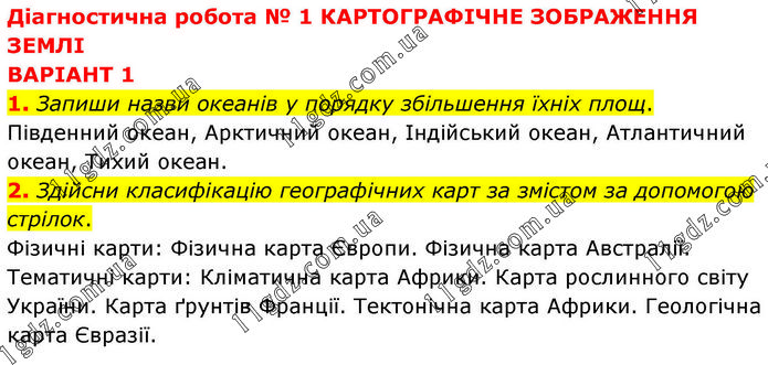 Діагностична робота № 1 КАРТОГРАФІЧНЕ ЗОБРАЖЕННЯ ЗЕМЛІ ВАРІАНТ 1 1. Запиши назви океанів у порядку збільшення їхніх площ. Південний океан, Арктичний океан, Індійський океан, Атлантичний океан, Тихий океан. 2. Здійсни класифікацію географічних карт за змістом за допомогою стрілок. Фізичні карти: Фізична карта Європи. Фізична карта Австралії. Тематичні карти: Кліматична карта Африки. Карта рослинного світу України. Карта ґрунтів Франції. Тектонічна карта Африки. Геологічна карта Євразії.