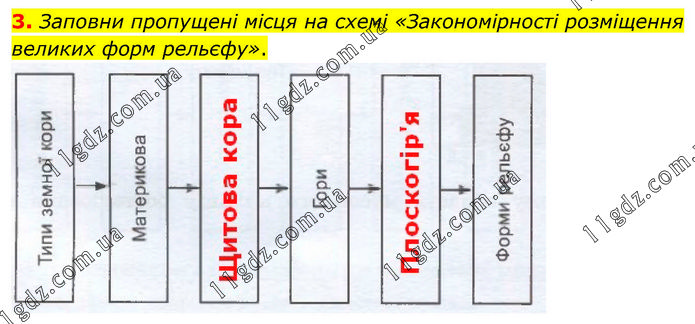 Заповни пропущені місця на схемі «Закономірності розміщення великих форм рельєфу».